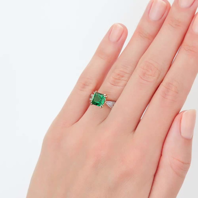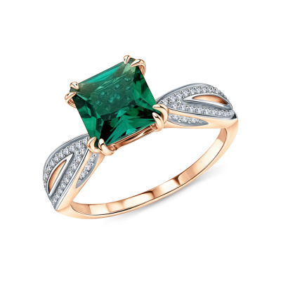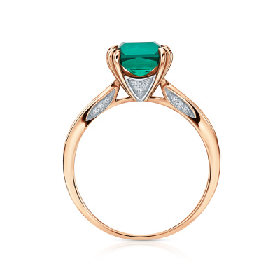 Кольцо с 2 бриллиантами природными, 0.008 карат, огранка круг 17 граней, цвет 2, чистота 2, тип огранки А; 8 бриллиантами природными, 0.02 карат, огранка круг 17 граней, цвет 2, чистота 2, тип огранки А; 56 бриллиантами природными, 0.1 карат, огранка круг 17 граней, цвет 2, чистота 2, тип огранки А; 1 гидротермальным изумрудом, 1.39 карат; Розовое золото 585 пробы.