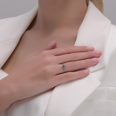 Кольцо с 30 бриллиантами природными, 0.06 карат, огранка круг 17 граней, цвет 2, чистота 2, тип огранки А; 1 танзанитом природным, 0.24 карат, тип огранки В; Розовое золото 585 пробы.