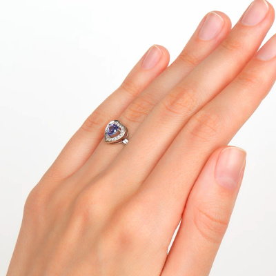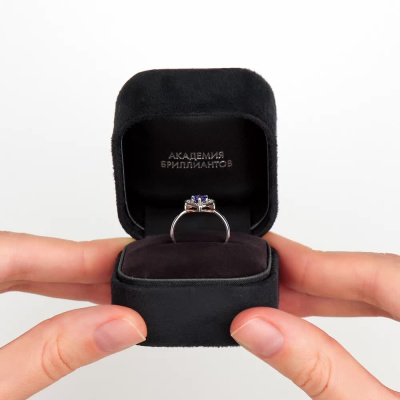 Кольцо с 17 бриллиантами природными, 0.05 карат, огранка круг 17 граней, цвет 2, чистота 2, тип огранки А; 1 танзанитом природным, 0.44 карат, тип огранки Б; Белое золото 585 пробы.