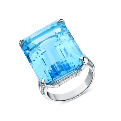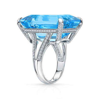Кольцо с 104 бриллиантами природными, 0.33 карат, огранка круг 57 граней, цвет 3, чистота 5, тип огранки А; 1 топазом скай природным, 46.7 карат, тип огранки В; Белое золото 585 пробы.