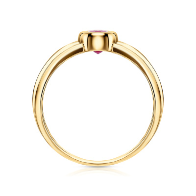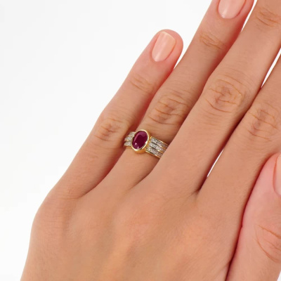Кольцо с 62 бриллиантами природными, 0.15 карат, огранка круг 17 граней, цвет 2, чистота 2, тип огранки А; 1 рубином природным, 1.05 карат, цвет 2, чистота 2, тип огранки Б; Желтое золото 585 пробы.