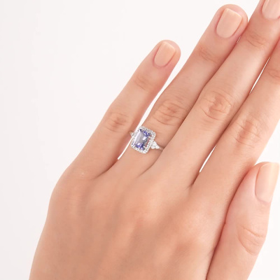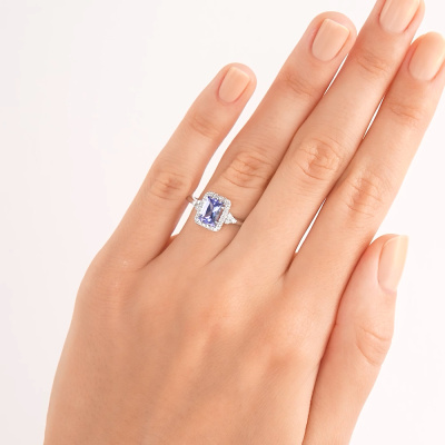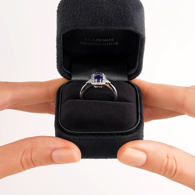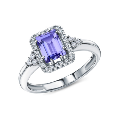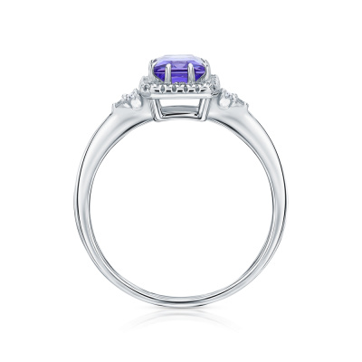 Кольцо с 6 бриллиантами природными, 0.07 карат, огранка круг 57 граней, цвет 3, чистота 6, тип огранки А; 24 бриллиантами природными, 0.08 карат, огранка круг 17 граней, цвет 2, чистота 2, тип огранки А; 1 танзанитом природным, 1.26 карат; Белое золото 585 пробы.