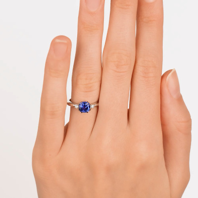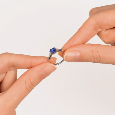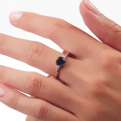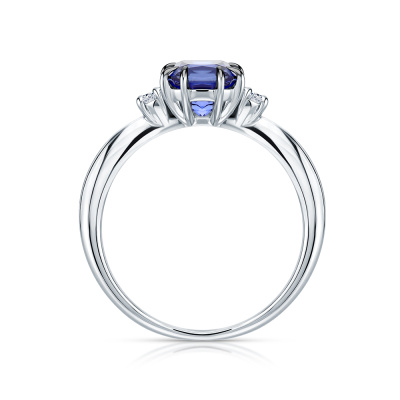 Кольцо с 1 сапфиром выращенным, 1.35 карат; 2 бриллиантами выращенными, 0.06 карат, огранка круг 57 граней, цвет 3, чистота 6, тип огранки А; Белое золото 585 пробы.