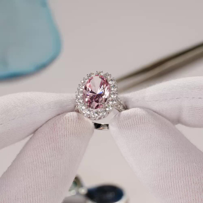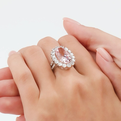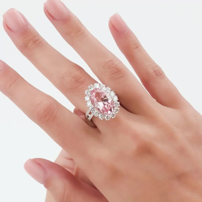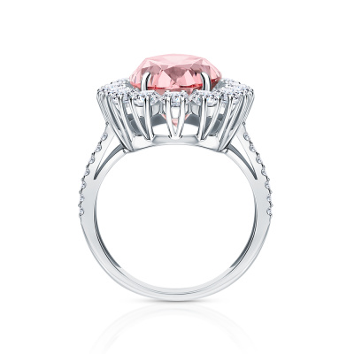 Кольцо с 1 розовым сапфиром выращенным, 9.165 карат; 16 бриллиантами выращенными, 1.651 карат, огранка круг 57 граней, цвет 3, чистота 5, тип огранки А; 28 бриллиантами выращенными, 0.211 карат, огранка круг 57 граней, цвет 3, чистота 5, тип огранки А; Белое золото 585 пробы.