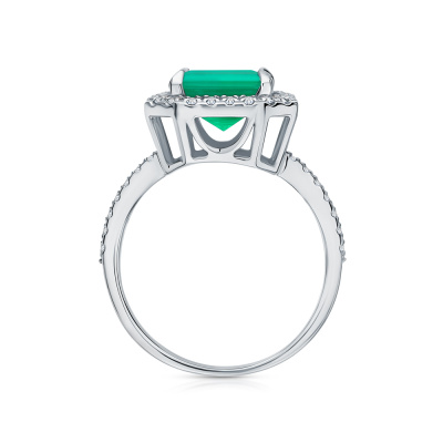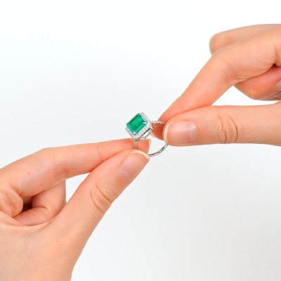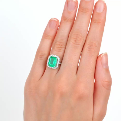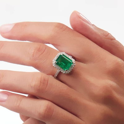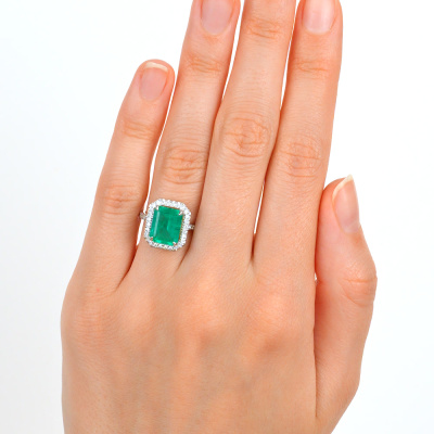 Кольцо с 1 изумрудом выращенным Колумбия, 2.89 карат; 42 бриллиантами выращенными, 0.29 карат, огранка круг 57 граней, цвет 3, чистота 5, тип огранки А; Белое золото 585 пробы.