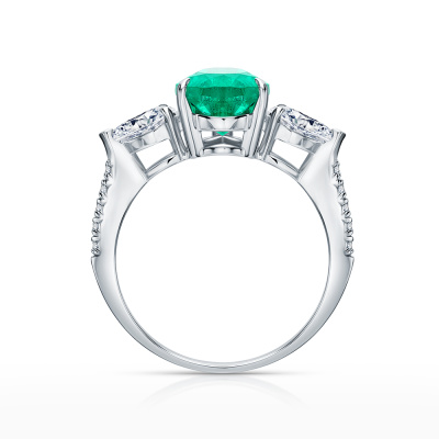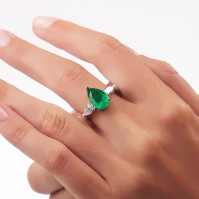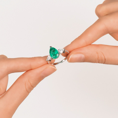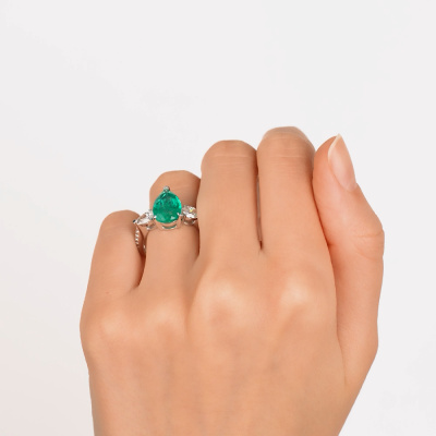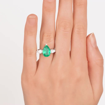Кольцо с 1 изумрудом выращенным Колумбия, 2.74 карат; 2 бриллиантами выращенными, 0.7 карат, огранка груша 56 граней, цвет 4, чистота 5, тип огранки А; 10 бриллиантами выращенными, 0.07 карат, огранка круг 57 граней, цвет 3, чистота 5, тип огранки А; Белое золото 585 пробы.