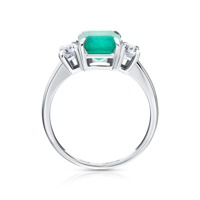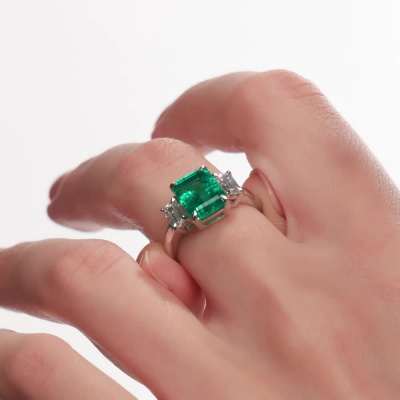 Кольцо с 1 изумрудом выращенным Колумбия, 2.15 карат; 2 бриллиантами выращенными, 0.63 карат, огранка изумрудная 65 граней, цвет 4, чистота 5, тип огранки А; Белое золото 585 пробы.