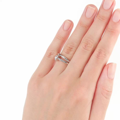 Кольцо с 11 бриллиантами природными, 0.14 карат, огранка круг 57 граней, цвет 3, чистота 6, тип огранки А; 3 бриллиантами природными, 0.006 карат, огранка круг 17 граней, цвет 2, чистота 2, тип огранки Б; Белое золото 585 пробы.