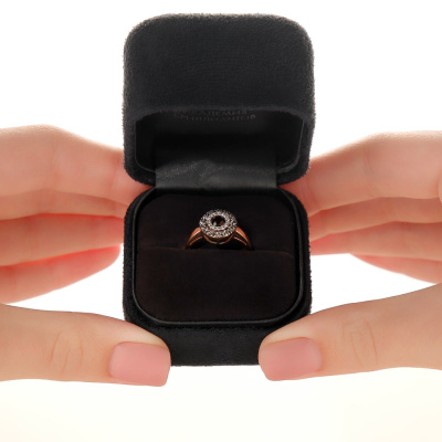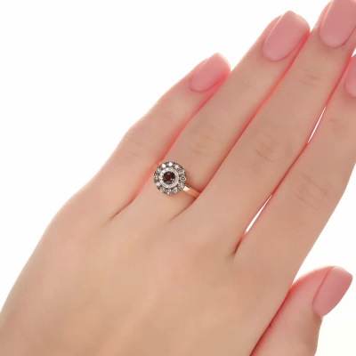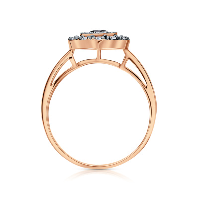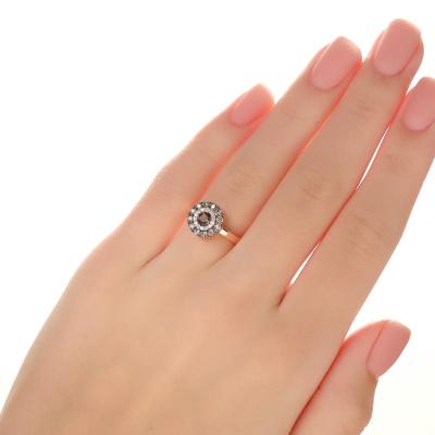 Кольцо с 14 бриллиантами природными, 0.05 карат, огранка круг 17 граней, цвет 2, чистота 2, тип огранки А; 1 кварцем дымчатым природным, 0.24 карат; 12 бриллиантами коньячными природными, 0.26 карат, огранка круг 57 граней, цвет 7, чистота 5, тип огранки А; Розовое и белое золото 585 пробы.