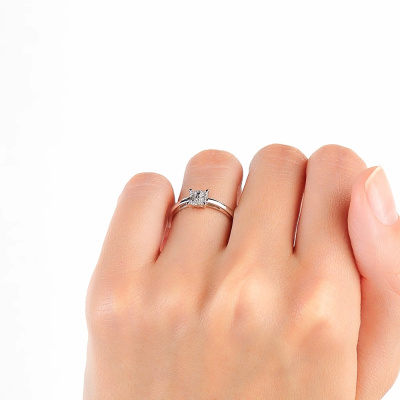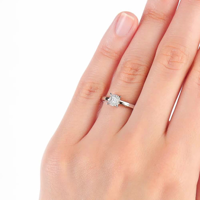 Кольцо с 3 бриллиантами природными, 0.11 карат, огранка багет 25 граней, цвет 3, чистота 5, тип огранки А; 2 бриллиантами природными, 0.01 карат, огранка круг 57 граней, цвет 3, чистота 6, тип огранки А; 4 бриллиантами природными, 0.01 карат, огранка круг 17 граней, цвет 2, чистота 3, тип огранки А; Белое золото 585 пробы.