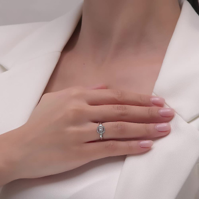 Кольцо с 5 бриллиантами природными, 0.19 карат, огранка багет 25 граней, цвет 3, чистота 5, тип огранки А; 24 бриллиантами природными, 0.08 карат, огранка круг 17 граней, цвет 2, чистота 3, тип огранки А; Белое золото 585 пробы.