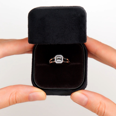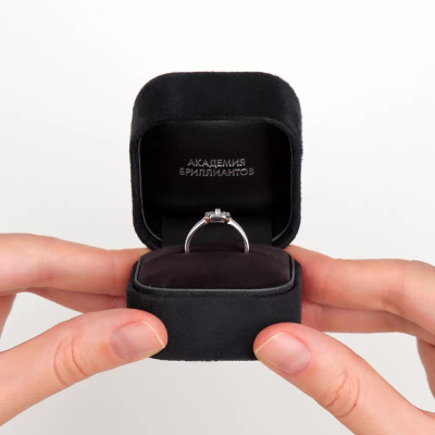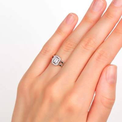 Кольцо с 3 бриллиантами природными, 0.1 карат, огранка багет 25 граней, цвет 3, чистота 5, тип огранки А; 24 бриллиантами природными, 0.07 карат, огранка круг 17 граней, цвет 2, чистота 3, тип огранки А; Белое золото 585 пробы.