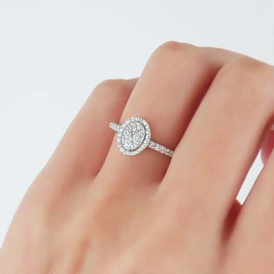 Кольцо с 4 бриллиантами природными, 0.19 карат, огранка круг 57 граней, цвет 3, чистота 6, тип огранки А; 12 бриллиантами природными, 0.08 карат, огранка круг 57 граней, цвет 3, чистота 6, тип огранки А; 20 бриллиантами природными, 0.09 карат, огранка круг 57 граней, цвет 3, чистота 6, тип огранки А; 4 бриллиантами природными, 0.009 карат, огранка круг 57 граней, цвет 3, чистота 6, тип огранки А; Белое золото 585 пробы.