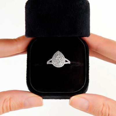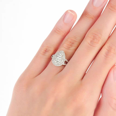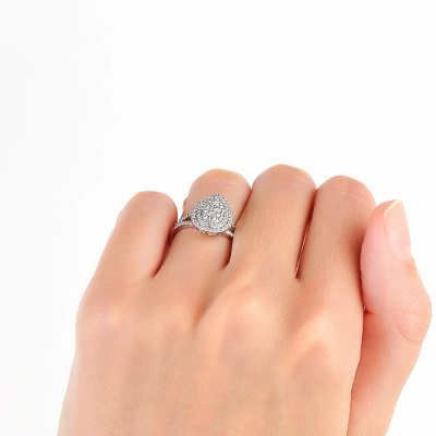 Кольцо с 6 бриллиантами природными, 0.17 карат, огранка круг 57 граней, цвет 3, чистота 6, тип огранки А; 2 бриллиантами природными, 0.03 карат, огранка круг 57 граней, цвет 3, чистота 6, тип огранки А; 20 бриллиантами природными, 0.14 карат, огранка круг 57 граней, цвет 3, чистота 6, тип огранки А; 50 бриллиантами природными, 0.23 карат, огранка круг 57 граней, цвет 3, чистота 6, тип огранки А; Белое золото 585 пробы.