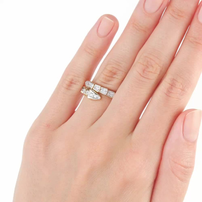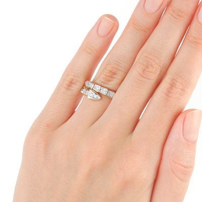 Кольцо с 2 бриллиантами природными, 0.04 карат, огранка круг 57 граней, цвет 3, чистота 6, тип огранки А; 17 бриллиантами природными, 0.23 карат, огранка круг 57 граней, цвет 3, чистота 6, тип огранки А; 18 бриллиантами природными, 0.12 карат, огранка круг 57 граней, цвет 3, чистота 6, тип огранки А; 2 бриллиантами природными, 0.008 карат, огранка круг 17 граней, цвет 2, чистота 3, тип огранки А; Желтое золото 585 пробы.