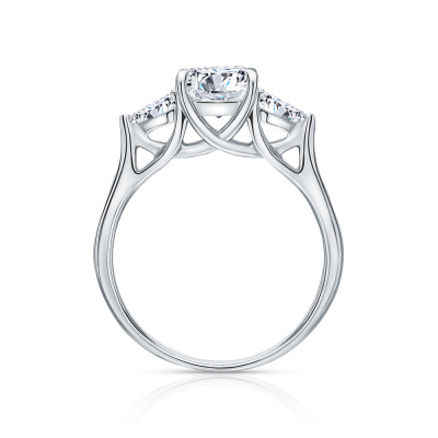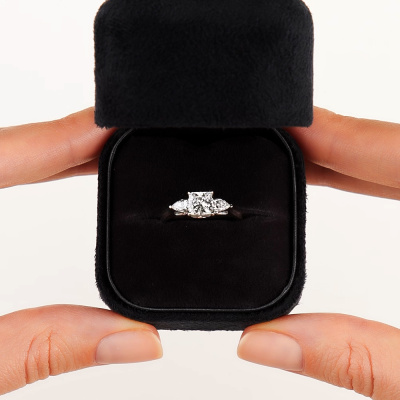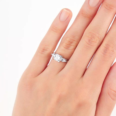 Кольцо с 1 бриллиантом выращенным, 1.01 карат, огранка принцесса 65 граней, цвет 4, чистота 5, тип огранки А; 2 бриллиантами выращенными, 0.33 карат, огранка груша 56 граней, цвет 3, чистота 5, тип огранки А; Белое золото 585 пробы.