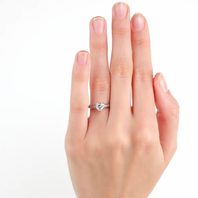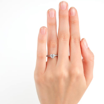 Кольцо с 1 бриллиантом выращенным, 0.87 карат, огранка сердце 57 граней, цвет 3, чистота 5, тип огранки А; 18 бриллиантами выращенными, 0.17 карат, огранка круг 57 граней, цвет 2, чистота 5, тип огранки А; Белое золото 585 пробы.