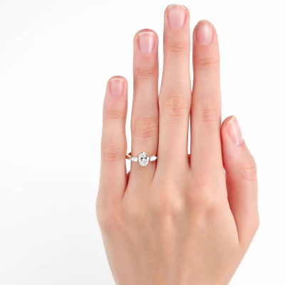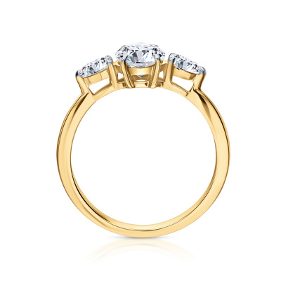 Кольцо с 1 бриллиантом выращенным, 0.84 карат, огранка овал 57 граней, цвет 4, чистота 5, тип огранки А; 2 бриллиантами выращенными, 0.25 карат, огранка груша 56 граней, цвет 3, чистота 5, тип огранки А; Желтое золото 585 пробы.