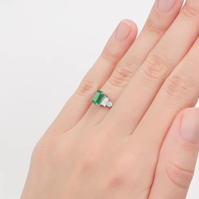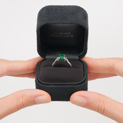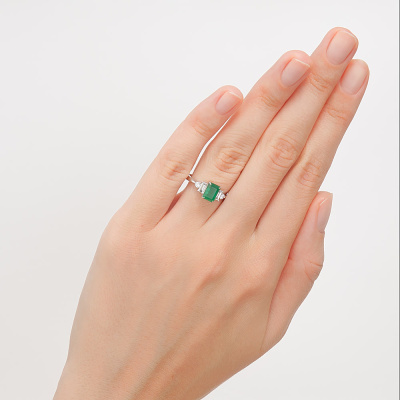 Кольцо с 2 бриллиантами природными, 0.174 карат, огранка багет 25 граней, цвет 3, чистота 6, тип огранки А; 2 бриллиантами природными, 0.088 карат, огранка круг 57 граней, цвет 3, чистота 6, тип огранки А; 1 изумрудом природным, 0.863 карат, цвет 3, чистота 3, тип огранки Б; Белое золото 585 пробы.