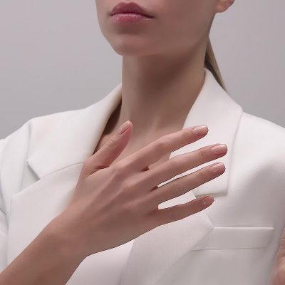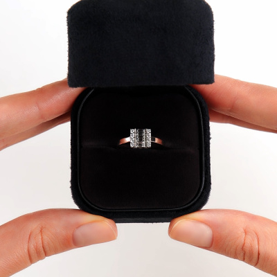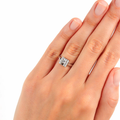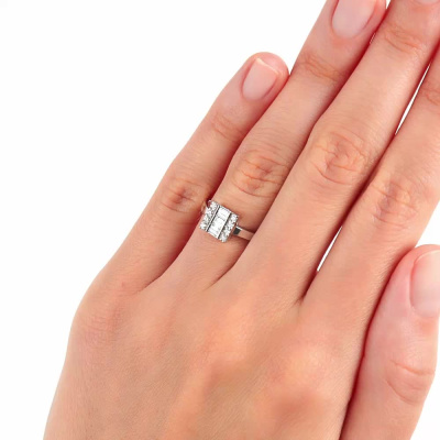 Кольцо с 3 бриллиантами природными, 0.24 карат, огранка багет 25 граней, цвет 3, чистота 3, тип огранки А; 8 бриллиантами природными, 0.1 карат, огранка круг 57 граней, цвет 3, чистота 6, тип огранки А; Белое золото 585 пробы.