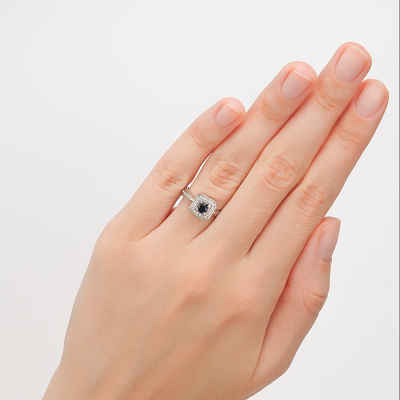 Кольцо с 10 бриллиантами природными, 0.03 карат, огранка круг 17 граней, цвет 2, чистота 2, тип огранки А; 20 бриллиантами природными, 0.04 карат, огранка круг 17 граней, цвет 2, чистота 2, тип огранки А; 1 сапфиром природным, 0.35 карат, цвет 2, чистота 2, тип огранки В; Белое золото 585 пробы.