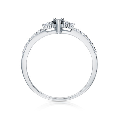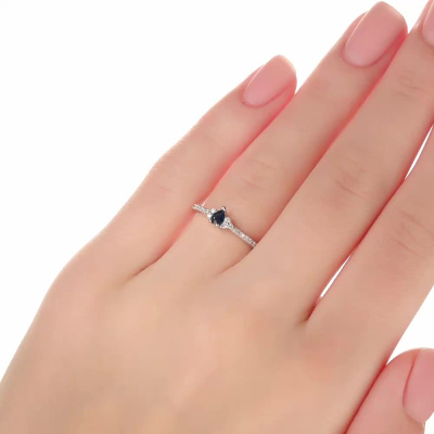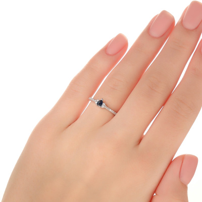 Кольцо с 6 бриллиантами природными, 0.04 карат, огранка круг 17 граней, цвет 2, чистота 2, тип огранки А; 14 бриллиантами природными, 0.04 карат, огранка круг 17 граней, цвет 2, чистота 2, тип огранки А; 1 сапфиром природным, 0.17 карат, цвет 2, чистота 2, тип огранки Б; Белое золото 585 пробы.