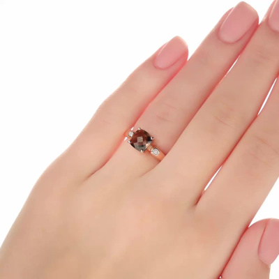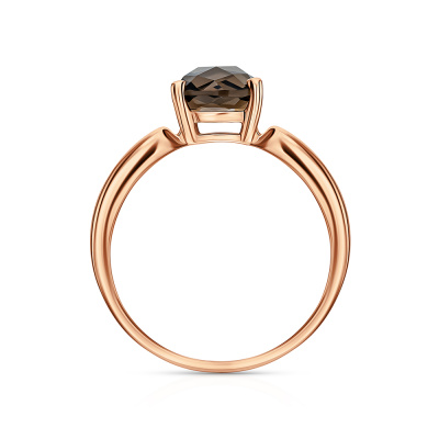 Кольцо с 2 бриллиантами природными, 0.02 карат, огранка круг 17 граней, цвет 2, чистота 2, тип огранки А; 1 кварцем дымчатым природным, 1.35 карат, тип огранки Б; Розовое золото 585 пробы.