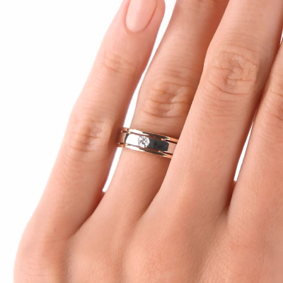 Кольцо с 1 бриллиантом природным, 0.08 карат, огранка круг 57 граней, цвет 3, чистота 6, тип огранки А; 12 бриллиантами природными, 0.02 карат, огранка круг 17 граней, цвет 2, чистота 2, тип огранки А; Розовое и белое золото 585 пробы.