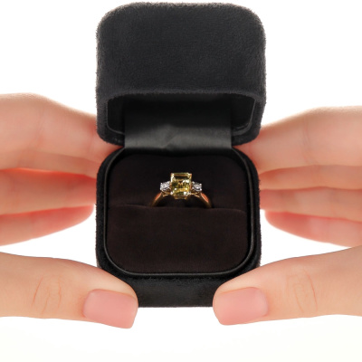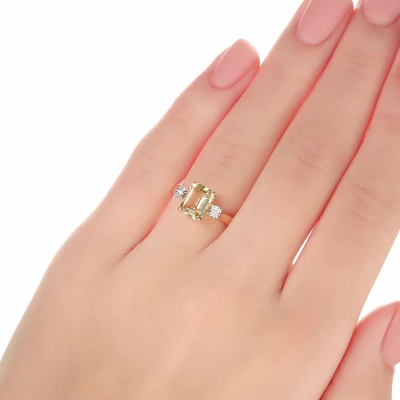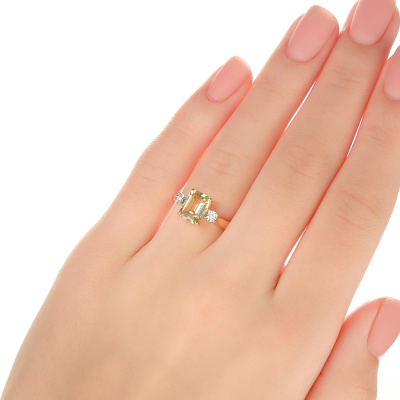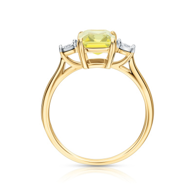 Кольцо с 2 бриллиантами природными, 0.01 карат, огранка круг 17 граней, цвет 2, чистота 2, тип огранки А; 1 кварцем лимонным природным, 1.43 карат; Желтое и белое золото 585 пробы.