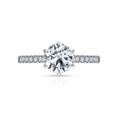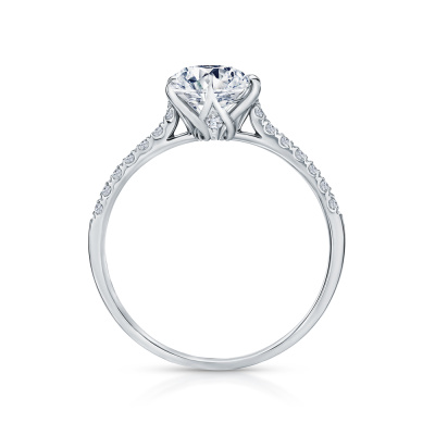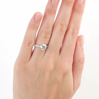Кольцо с 1 бриллиантом выращенным, 1.54 карат, огранка круг 57 граней, цвет 4, чистота 5, тип огранки А; 16 бриллиантами выращенными, 0.19 карат, огранка круг 57 граней, цвет 3, чистота 5, тип огранки А; Белое золото 585 пробы.