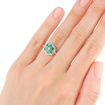 Кольцо с 3 бриллиантами природными, 0.04 карат, огранка круг 57 граней, цвет 3, чистота 6; 4 бриллиантами природными, 0.03 карат, огранка круг 17 граней, цвет 2, чистота 3; 28 бриллиантами природными, 0.17 карат, огранка круг 17 граней, цвет 2, чистота 3; 2 бриллиантами природными, 0.01 карат, огранка круг 17 граней, цвет 2, чистота 3; 6 изумрудами природными, 0.77 карат, цвет 4, чистота 3; Желтое золото 585 пробы.
