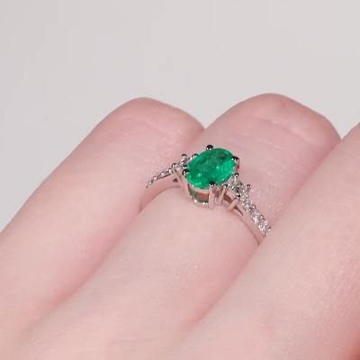 Кольцо с 8 бриллиантами природными, 0.23 карат, огранка круг 57 граней, цвет 3, чистота 6, тип огранки А; 2 бриллиантами природными, 0.007 карат, огранка принцесса 65 граней, цвет 3, чистота 6, тип огранки А; 1 изумрудом природным, 0.72 карат, цвет 4, чистота 3, тип огранки Б; Белое золото 585 пробы.