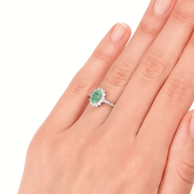Кольцо с 14 бриллиантами природными, 0.23 карат, огранка круг 57 граней, цвет 3, чистота 6; 12 бриллиантами природными, 0.08 карат, огранка круг 17 граней, цвет 2, чистота 3; 1 изумрудом природным, 0.68 карат, цвет 4, чистота 3; Белое золото 585 пробы.
