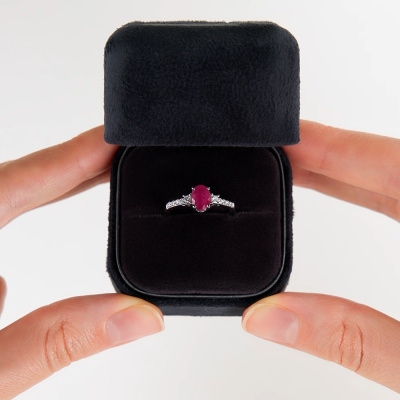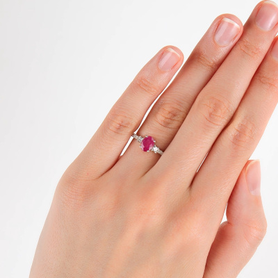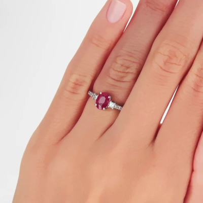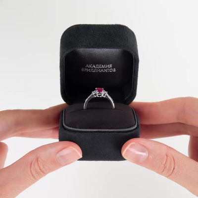 Кольцо с 2 бриллиантами природными, 0.09 карат, огранка принцесса 65 граней, цвет 3, чистота 6; 8 бриллиантами природными, 0.13 карат, огранка круг 57 граней, цвет 3, чистота 6; 1 рубином природным, 0.91 карат, цвет 3, чистота 4; Белое золото 585 пробы.