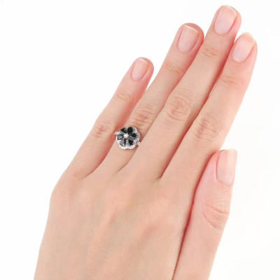 Кольцо с 3 бриллиантами природными, 0.05 карат, огранка круг 57 граней, цвет 3, чистота 6; 4 бриллиантами природными, 0.04 карат, огранка круг 17 граней, цвет 2, чистота 3; 28 бриллиантами природными, 0.17 карат, огранка круг 17 граней, цвет 2, чистота 3; 2 бриллиантами природными, 0.01 карат, огранка круг 17 граней, цвет 2, чистота 3; 6 сапфирами природными, 1.11 карат, цвет 3, чистота 4; Белое золото 585 пробы.