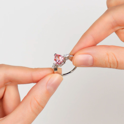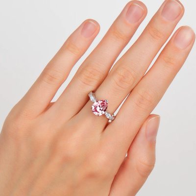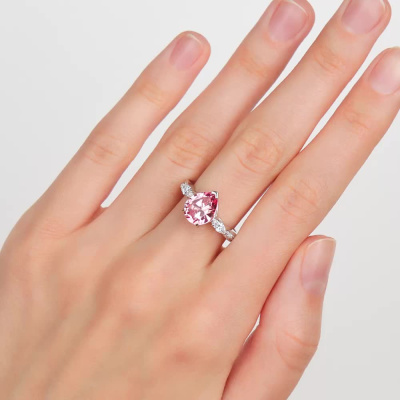 Кольцо с 1 розовым сапфиром выращенным, 3.08 карат; 2 бриллиантами выращенными, 0.23 карат, огранка маркиз 55 граней, цвет 3, чистота 5, тип огранки А; 12 бриллиантами выращенными, 0.08 карат, огранка круг 57 граней, цвет 3, чистота 5, тип огранки А; Белое золото 585 пробы.