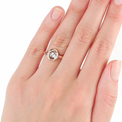 Кольцо с 1 бриллиантом природным, 0.01 карат, огранка круг 57 граней, цвет 3, чистота 6, тип огранки А; 8 бриллиантами природными, 0.03 карат, огранка круг 17 граней, цвет 2, чистота 2, тип огранки А; Розовое золото 585 пробы.