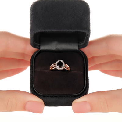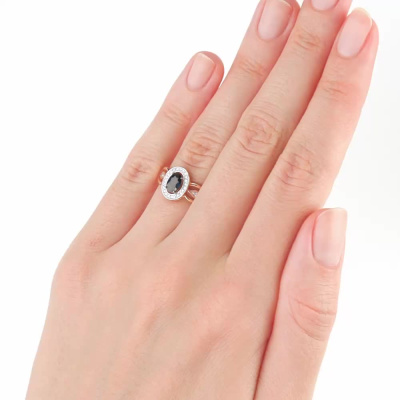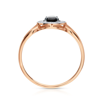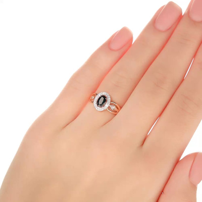 Кольцо с 25 бриллиантами природными, 0.08 карат, огранка круг 17 граней, цвет 2, чистота 2, тип огранки А; 1 сапфиром природным, 0.57 карат, цвет 2, чистота 2, тип огранки Б; Розовое золото 585 пробы.