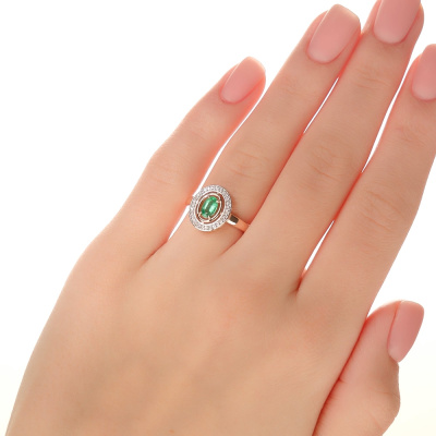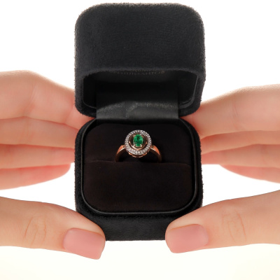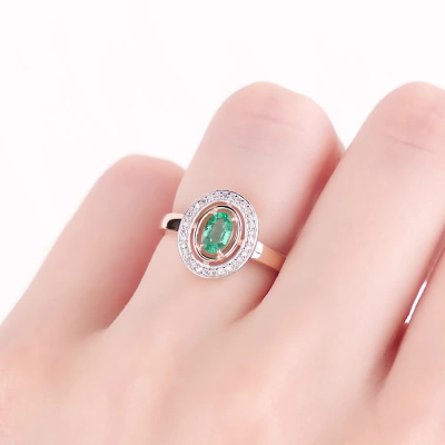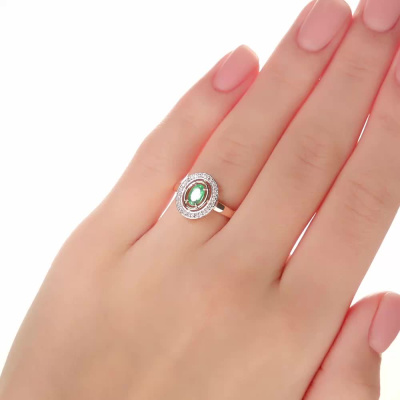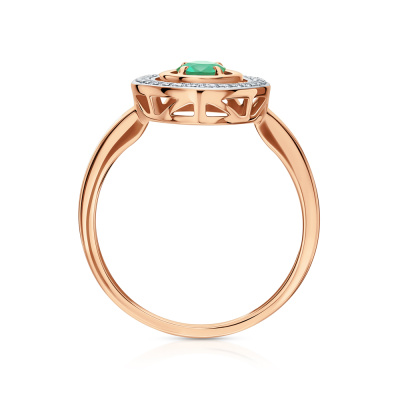 Кольцо с 31 бриллиантом природным, 0.07 карат, огранка круг 17 граней, цвет 2, чистота 2, тип огранки А; 1 изумрудом природным, 0.4 карат, цвет 3, чистота 3, тип огранки Б; Розовое золото 585 пробы.