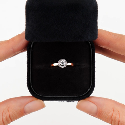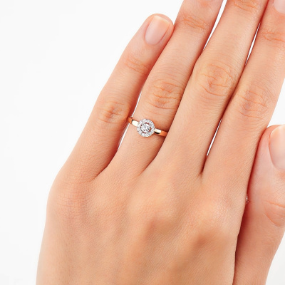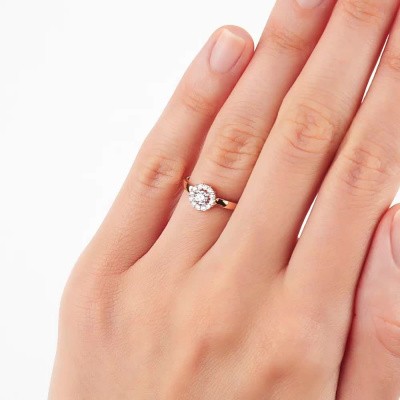 Кольцо с 1 бриллиантом выращенным, 0.12 карат, огранка круг 57 граней, цвет 3, чистота 6, тип огранки А; 12 бриллиантами выращенными, 0.09 карат, огранка круг 57 граней, цвет 3, чистота 6, тип огранки А; Розовое золото 585 пробы.
