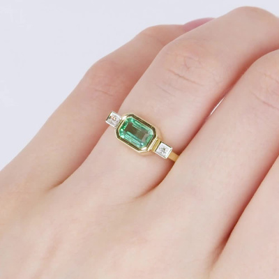 Кольцо с 2 бриллиантами природными, 0.03 карат, огранка круг 57 граней, цвет 3, чистота 6, тип огранки А; 1 изумрудом природным, 0.89 карат, цвет 3, чистота 3, тип огранки Б; Желтое золото 585 пробы.
