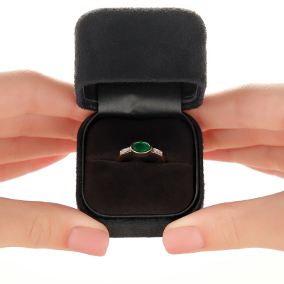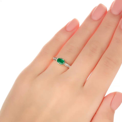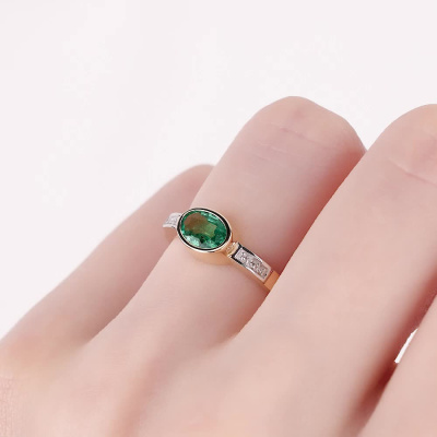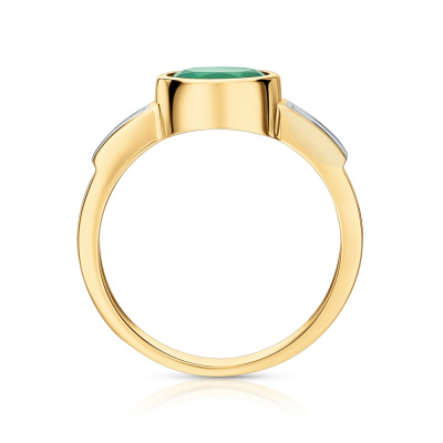 Кольцо с 6 бриллиантами природными, 0.02 карат, огранка круг 17 граней, цвет 2, чистота 2, тип огранки А; 1 изумрудом природным, 0.84 карат, цвет 3, чистота 3, тип огранки Б; Желтое золото 585 пробы.