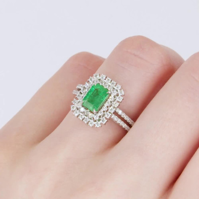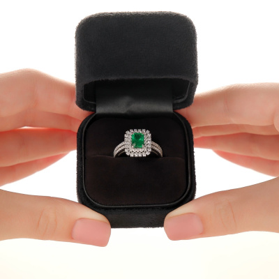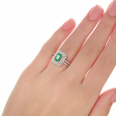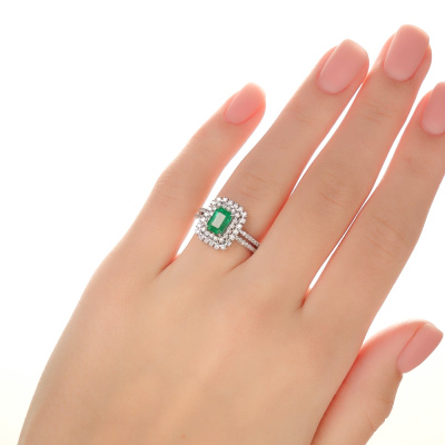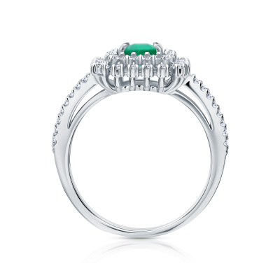 Кольцо с 22 бриллиантами природными, 0.24 карат, огранка круг 57 граней, цвет 3, чистота 6, тип огранки А; 18 бриллиантами природными, 0.13 карат, огранка круг 57 граней, цвет 3, чистота 6, тип огранки А; 32 бриллиантами природными, 0.13 карат, огранка круг 17 граней, цвет 2, чистота 2, тип огранки А; 1 изумрудом природным, 0.81 карат, цвет 3, чистота 3, тип огранки Б; Белое золото 585 пробы.