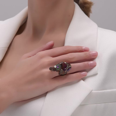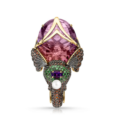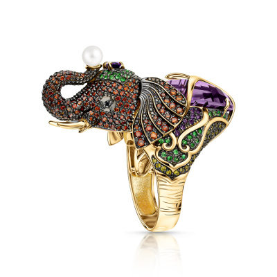 Кольцо с 1 аметрином, 23.84 карат, тип огранки А; 1 жемчугом пресноводным культивированным белым, 0.49 карат, тип огранки А; 1 аметистом природным, 0.22 карат, тип огранки А; 20 бриллиантами коричневыми природными, 0.31 карат, огранка круг 57 граней, цвет 7, чистота 6, тип огранки А; 10 бриллиантами коричневыми природными, 0.09 карат, огранка круг 57 граней, цвет 7, чистота 6, тип огранки А; 77 гранатами зелеными природными, 0.43 карат, тип огранки А; 24 аметистами природными, 0.13 карат, тип огранки А; 40 бриллиантами желтыми природными облагороженными, 0.21 карат, огранка круг 57 граней, цвет 5, чистота 5, тип огранки А; 224 бриллиантами коричневыми природными, 1.02 карат, огранка круг 57 граней, цвет 7, чистота 6, тип огранки А; 2 бриллиантами черными природными облагороженными, 0.008 карат, огранка круг 57 граней, цвет 7, чистота 6, тип огранки А; Желтое золото 585 пробы.