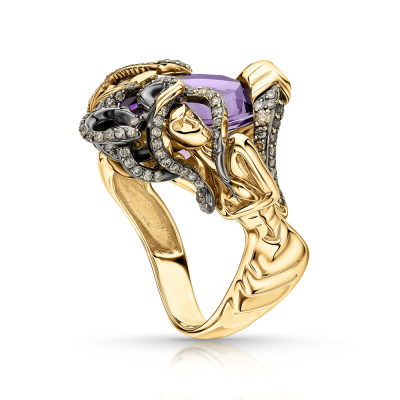 Кольцо с 1 аметистом природным, 7.94 карат, тип огранки А; 1 бриллиантом коричневым природным, 0.01 карат, огранка круг 57 граней, цвет 7, чистота 6, тип огранки А; 4 бриллиантами коричневыми природными, 0.03 карат, огранка круг 57 граней, цвет 7, чистота 6, тип огранки А; 86 бриллиантами коричневыми природными, 0.43 карат, огранка круг 57 граней, цвет 7, чистота 5, тип огранки А; Желтое золото 585 пробы.