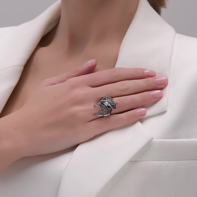 Кольцо с 1 топазом лондон природным, 2.61 карат, тип огранки А; 3 бриллиантами черными природными облагороженными, 0.02 карат, огранка круг 57 граней, цвет 7, чистота 6, тип огранки А; 22 бриллиантами черными природными облагороженными, 0.11 карат, огранка круг 57 граней, цвет 7, чистота 6, тип огранки А; Белое золото 585 пробы.