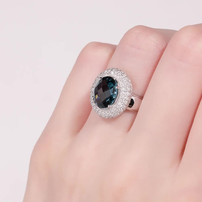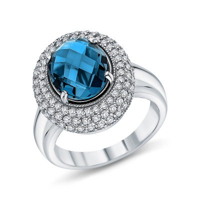 Кольцо с 1 топазом лондон природным, 2.67 карат, тип огранки Б; 63 бриллиантами, 0.44 карат, огранка круг 57 граней, цвет 3, чистота 5, тип огранки А; 32 бриллиантами, 0.15 карат, огранка круг 57 граней, цвет 4, чистота 6, тип огранки А; Белое золото 585 пробы.