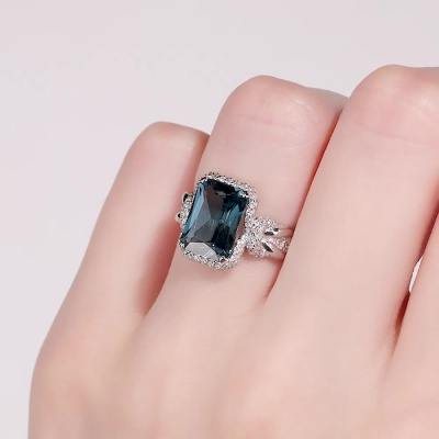 Кольцо с 128 бриллиантами природными, 0.71 карат, огранка круг 57 граней, цвет 4, чистота 5, тип огранки А; 1 топазом лондон природным, 3.84 карат, тип огранки А; Белое золото 585 пробы.