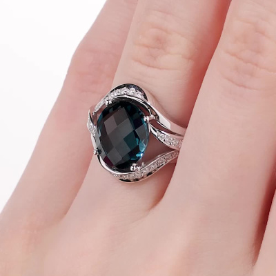 Кольцо с 18 бриллиантами природными, 0.18 карат, огранка круг 57 граней, цвет 3, чистота 6, тип огранки А; 14 бриллиантами природными, 0.08 карат, огранка круг 57 граней, цвет 3, чистота 5, тип огранки А; 1 топазом лондон природным, 4.77 карат, тип огранки А; Белое золото 585 пробы.