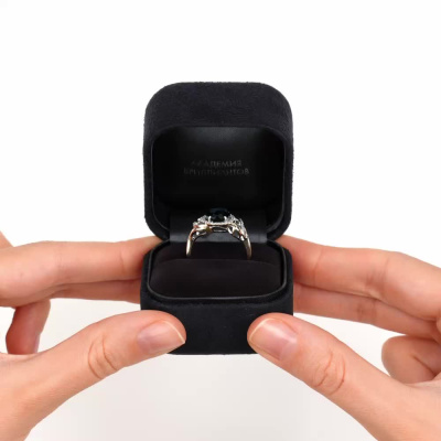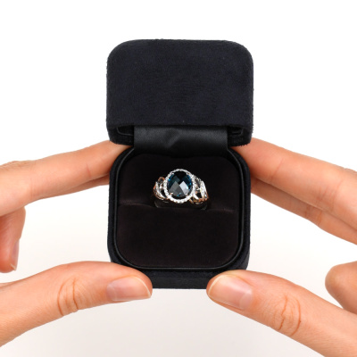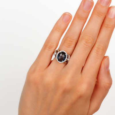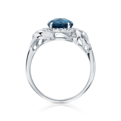 Кольцо с 34 бриллиантами природными, 0.16 карат, огранка круг 57 граней, цвет 3, чистота 5, тип огранки А; 1 топазом лондон природным, 2.85 карат, тип огранки А; Белое золото 585 пробы.
